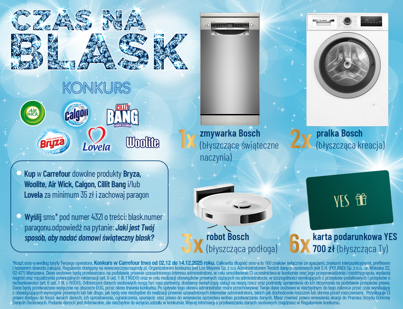 Konkurs prowadzony jest pod nazwą „Czas na blask!” (zwany dalej „Konkursem”), na terenie całej Polski, w sklepach sieci Carrefour i Carrefour Market oraz w sklepie internetowym www.carrefour.pl (zwanych dalej łącznie „Carrefour”), zajmujących się sprzedażą detaliczną między innymi produktów marek Bryza, Woolite, Air Wick, Calgon, Cillit Bang i Lovela.