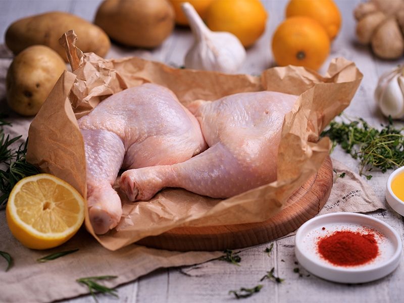 Przygotowujemy marynatę do kurczaka. W miseczce umieszczamy oliwę, ocieramy skórkę z jednej cytryny i wyciskamy sok. Dodajemy słodką paprykę, wyciśnięty czosnek oraz miód. Kroimy świeży rozmaryn i tymianek, dodajemy do marynaty. Imbir drobno siekamy. Doprawiamy solą i pieprzem. Za pomocą moździerza, widelca lub blendera przygotowujemy masło czosnkowe: masło w temperaturze pokojowej ucieramy razem z wyciśniętym czosnkiem i pokrojonym tymiankiem.