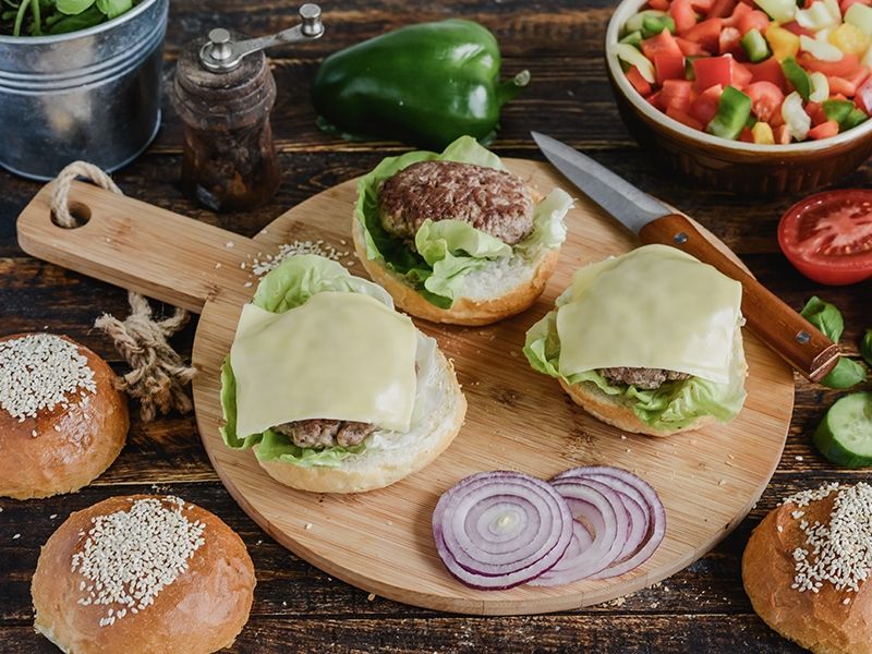 Burgery wołowe smażymy na patelni z odrobiną tłuszczu ok 3-4 min z każdej strony. W międzyczasie rozgrzewamy piekarnik, aby podpiec w nim bułki. Papryki kroimy w kostkę i mieszamy ze sobą, a pomidora, ogórka oraz cebule – w plasterki. Do przekrojonych bułek wkładamy po plasterku sałaty, usmażonego burgera, plasterek sera, pomidora, ogórka, cebulę, mieszankę pokrojonych papryk oraz kolejny listek sałaty. Górną część bułki smarujemy musztardą i przykrywamy nią całość.