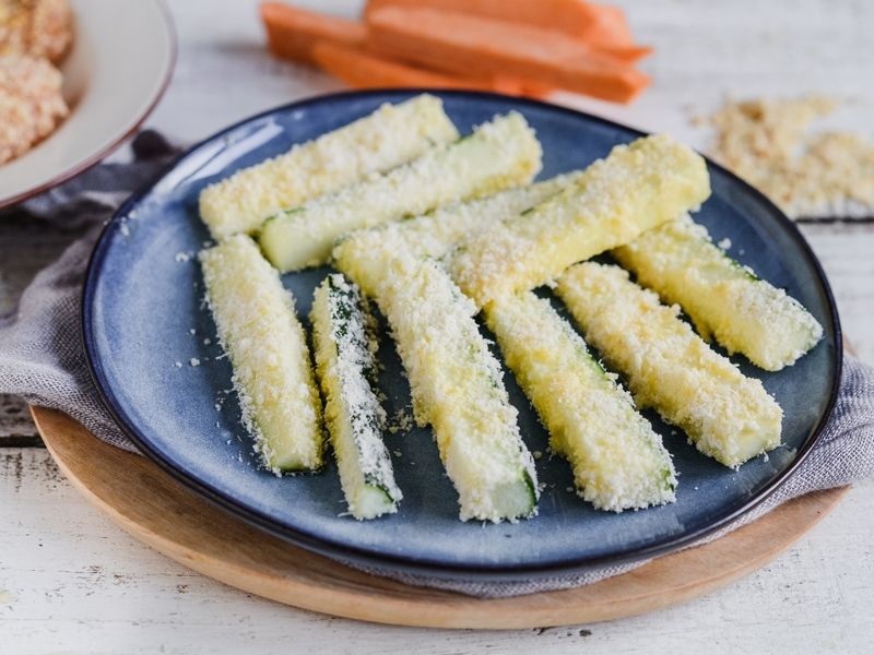 Do miski wbijamy jajko, dodajemy mleko, sól i pieprz. Cukinię obtaczamy, po czym posypujemy tartym parmezanem wymieszanym z bułką tartą. Układamy na blaszce wyłożonej papierem do pieczenia.
