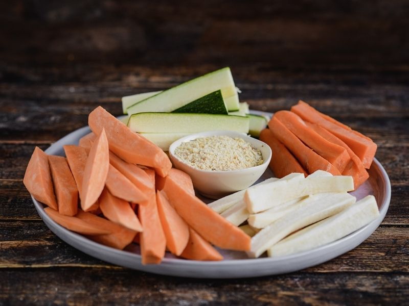 Batata, marchewkę i pietruszkę kroimy w słupki. Układamy na blaszce wyłożonej papierem do pieczenia. Polewamy łyżką oliwy oraz posypujemy solą, pieprzem i oregano. Cukinię kroimy w słupki.
