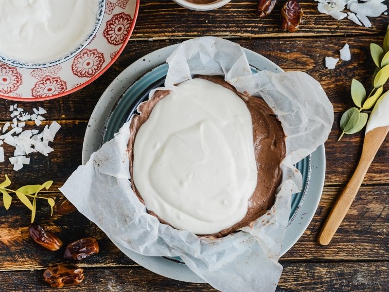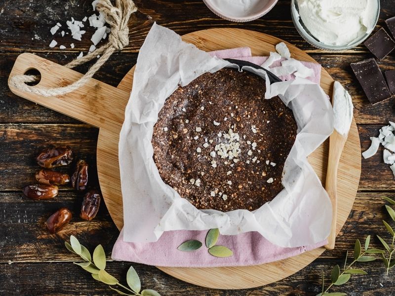 Daktyle zalewamy gorącą wodą i moczymy kilka minut. Odsączamy i miksujemy w blenderze na gładką pastę. Dodajemy łyżkę kakao, płatki owsiane oraz migdały. Całość blendujemy na jednolitą masę. Formę na ciasto wykładamy papierem do pieczenia. Dno wylepiamy daktylową pastą i podpiekamy przez 10 min. w piekarniku nagrzanym do 180 C.