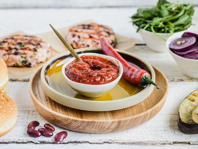Bułki smarujemy od wewnątrz sosem chili. Następnie na jednej połówce układamy kilka listków rukoli, ugrillowanego burgera, plaster bakłażana, krążek cebuli i przykrywamy drugą bułką.