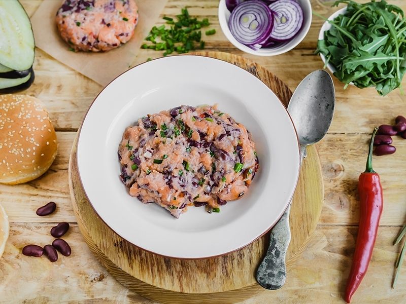 Łososia myjemy, odrywamy skórę i bardzo drobno siekamy. Osuwamy w międzyczasie wszystkie ości i błonki. Mieszamy ze zblendowaną czerwoną fasolką. Doprawiamy solą, pieprzem, ostrą papryką oraz posiekanym szczypiorkiem.
