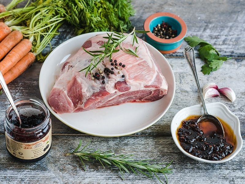 Karkówkę myjemy i dokładnie suszymy. Konfiturę łączymy z trzema łyżkami oliwy oliwy, startym czosnkiem, cynamonem, słodką papryką, solą oraz pieprzem. Mięso nacieramy powstałą marynatą i odstawiamy na min. 1 godz. do lodówki. Piekarnik nagrzewamy do 180C. Przekładamy karkówkę do naczynia żaroodpornego i pieczemy ją ok. 20 min bez przykrycia. Po tym czasie polewamy karkówkę 200 mln wody i pieczemy pod przykryciem ok. 2 godz.