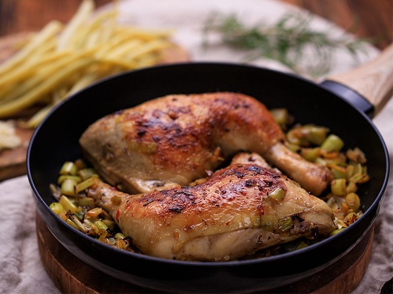 Na patelni rozgrzewamy oliwę i smażymy kurczaka skórą do dołu ok. 5 minut, aż skórka się zrumieni, następnie odwracamy mięso na drugą stronę i smażymy kolejne 5 minut. Dodajemy pora i 4 ząbki czosnku. Gdy por się zeszkli, dolewamy odrobinę wody i dusimy wszystko ok. 20 minut. Gdy kurczak będzie gotowy, wykładamy go na talerz. Do pora na patelni dolewamy 100 ml śmietany 30% oraz 1 czubatą dużą łyżkę musztardy Dijon i całość mieszamy podgrzewając kilka minut. Danie serwujemy z sosem porowym oraz fasolką szparagową.
