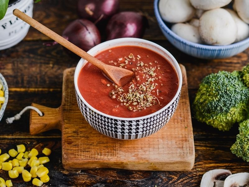 Do rondelka wlewamy oliwę. Dodajemy pokrojoną cebulkę i podsmażamy. Następnie wlewamy passatę i gotujemy na niewielkim ogniu. Doprawiamy bazylią, rozmarynem, sola i pieprzem. Gdy sos stanie się gesty, odstawiamy na bok.