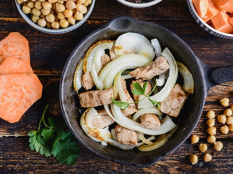 Następnie obsmażamy mięso na patelni cały czas mieszając. Przekładamy do garnka. Na tej samej patelni smażymy posiekany czosnek i cebulę pokrojona w piórka. Doprawiamy kuminem, cynamonem, kolendrą, chili i przekładamy całość do garnka. Zalewamy szklanka wody. Dodajemy ziele angielskie, liść laurowy i gotujemy ok 30 min. W połowie gotowania dodajemy pokrojony w kostkę batat lub dynię. I gotujemy dalej. Następnie dokładamy ciecierzycę , koncentrat pomidorowy oraz szczyptę cukru. Dusimy całość kolejne 10 min.