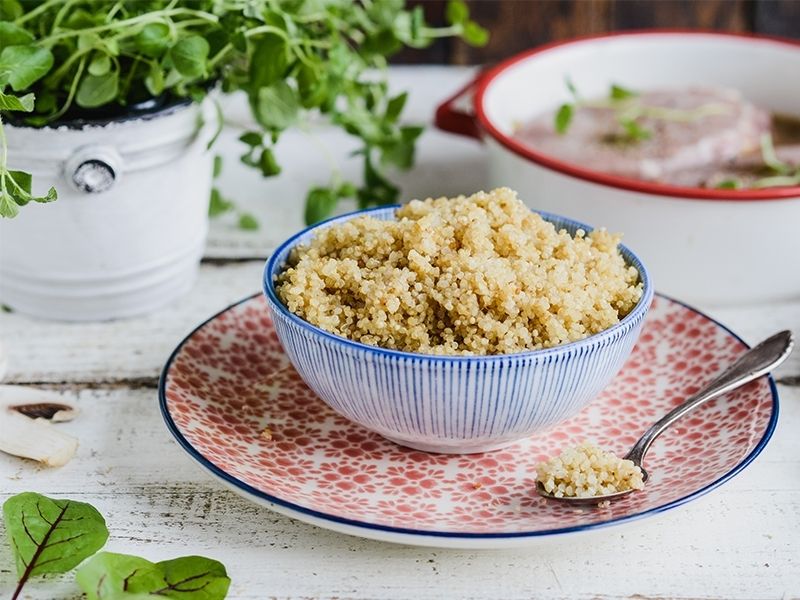 Komosę gotujemy do miękkości wedle instrukcji na opakowaniu. Pieczarki myjemy, kroimy w ćwiartki i podsmażamy na suchej patelni. Po kilku minutach dodajemy łyżeczkę masła i podsmażamy na złoty kolor. Odkładamy na bok.