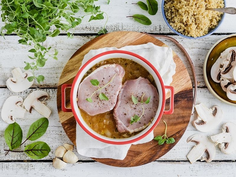 Około 10. min przed końcem gotowania dokładamy do mięsa pieczarki. Następnie dodajemy mąkę i delikatnie mieszamy. Gdy sos zgęstnieje posypujemy go natką pietruszki. Mięso podajemy z komosa ryżową i ulubioną sałatką.