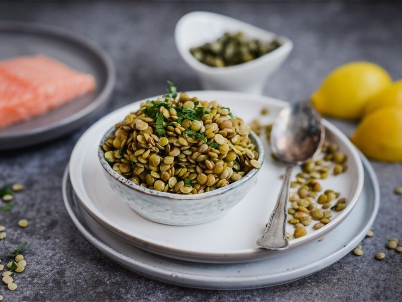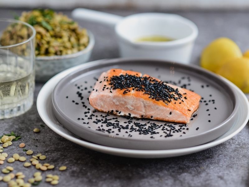 Soczewicę gotujemy przez 20 min. na małym ogniu w 120 ml wody. W międzyczasie dodajemy łyżkę oliwy i szczyptę soli. Po zdjęciu z ognia dodajemy sok z cytryny, łyżkę zielonej pietruszki i dokładnie mieszamy. Filet z łososia myjemy, oprószamy solą i pieprzem, nacieramy oliwą. Pieczemy na patelni ok. 5 min., następnie przekładamy na drugą stronę. Pod koniec pieczenia posypujemy czarnuszką i dociskamy ją do ryby.