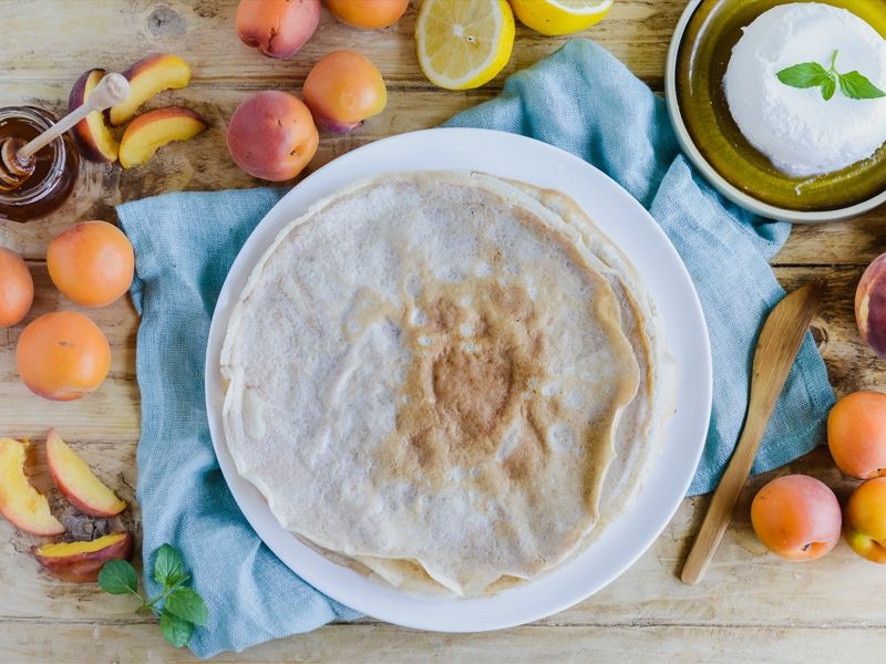 Upieczone naleśniki smarujemy musem z sera ricotta. Wierzch dekorujemy kawałkami świeżych moreli i brzoskwiń.