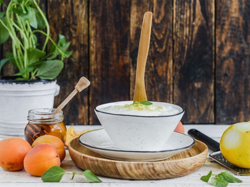 W międzyczasie ricottę mieszamy z miodem i jogurtem. Doprawiamy do smaku skórką otartą z jednej cytryny.
