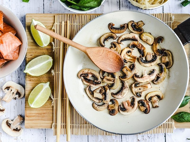 Umyte pieczarki kroimy na plasterki. Smażymy na patelni z odrobiną oliwy przez 2-3 min. z każdej strony. Do gotującego się bulionu wkładamy łososia i trzymamy pod przykryciem przez 3-4 min. Następnie dodajemy usmażone pieczarki oraz listki szpinaku. Po kilku chwilach dodajemy posiekaną cebulę dymkę. Gotujemy 2 min. Podajemy z ugotowanym makaronem, świeżą kolendrą i sezamem.