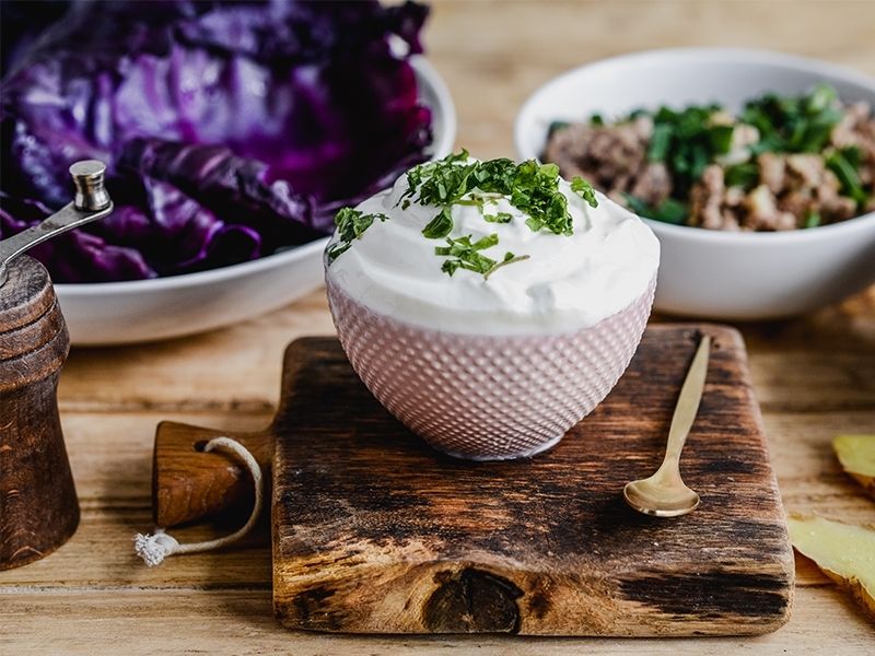 Do jogurtu dodajemy posiekaną miętę. Doprawiamy solą oraz pieprzem. Sos podajemy z gołąbkami.