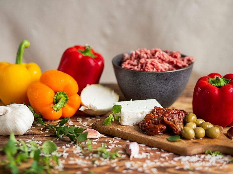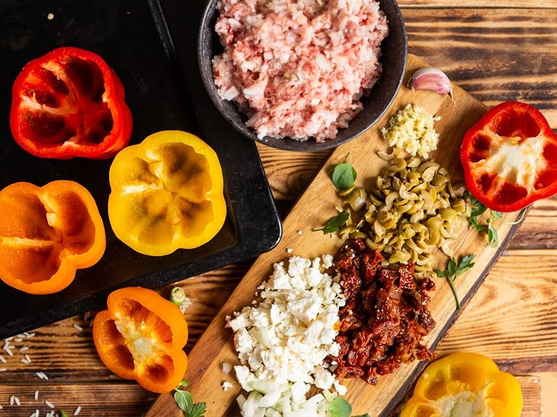 Cebulę, czosnek, oliwki, suszone pomidory i fetę drobno kroimy. Razem z ryżem wsypujemy do mięsa i całość mieszamy. Doprawiamy solą, pieprzem, słodką papryką i świeżym oregano, dodajemy oliwę.