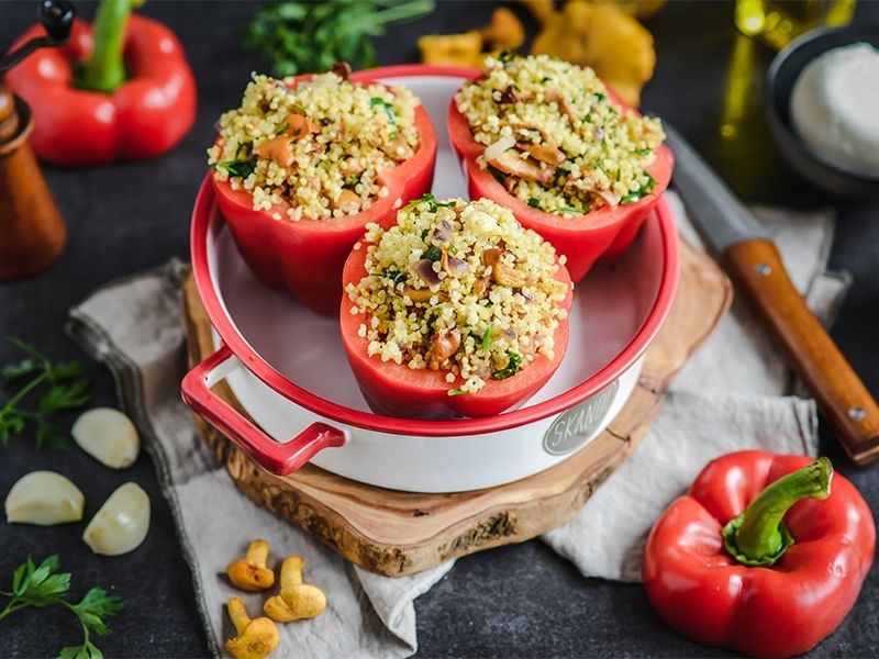 Papryki myjemy, ścinamy górę i wydrążamy gniazdo. Do wy drążonych papryk nakładamy porcję kaszy z kurkami. Papryki przykrywamy odkrojoną częścią i wstawiamy do piekarnika nagrzanego do 180 C na ok. 30 min. Następnie zdejmujemy kapelusz i posypujemy serem mozzarella i wkładamy po raz kolejny do piekarnika na ok. 10 min.