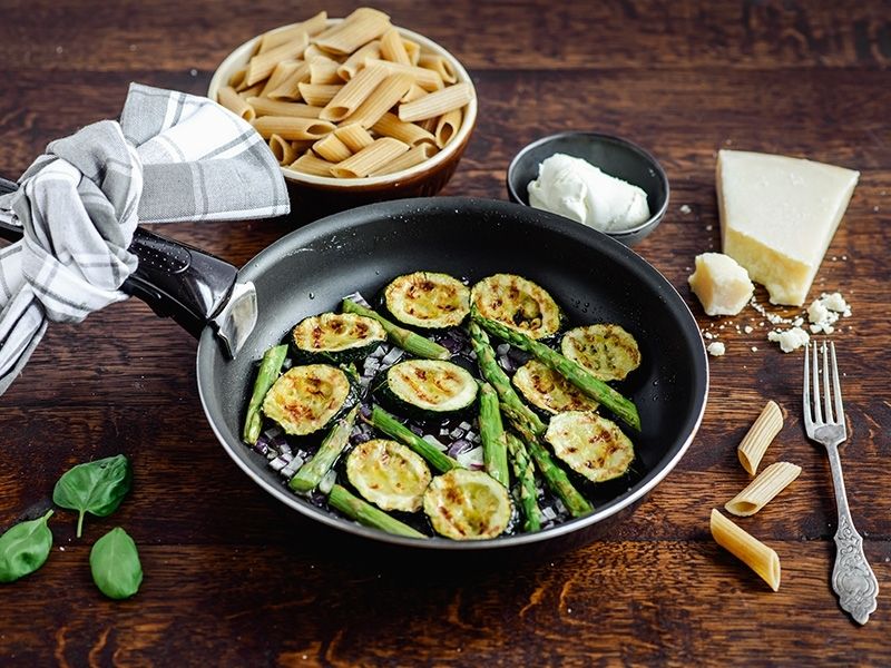 Gotujemy makaron. Rozgrzewamy patelnię grillową z odrobiną oliwy. Ze szparagów odłamujemy sztywne końce. Cukinię kroimy na cienkie krążki. Oprószamy pieprzem i nacieramy czosnkiem. Szparagi oraz cukinię grillujemy na patelni 3 min. z każdej strony.
