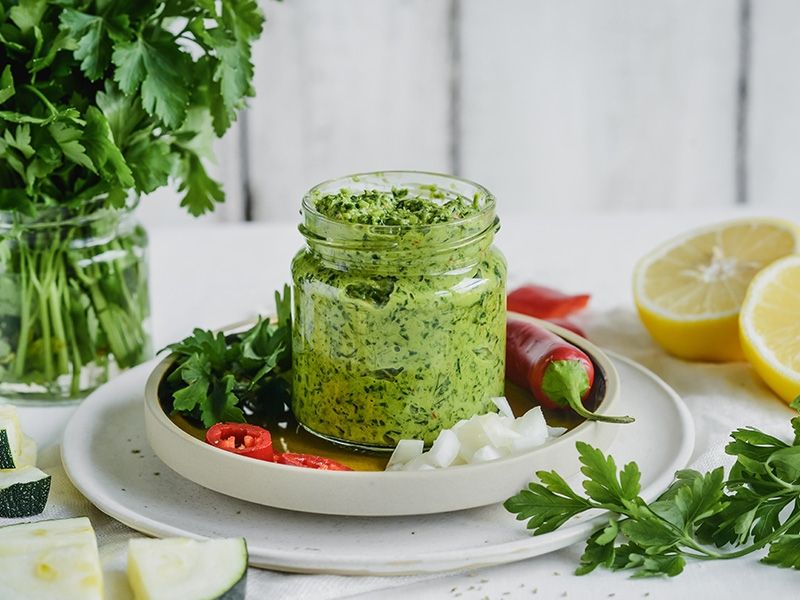 Cukinie oraz paprykę kroimy w kosteczkę i skrapiamy oliwą. Ryby układamy na blaszce wyłożonej papierem do pieczenia. Obkładamy dookoła warzywami i pieczemy ok. 15-10 min. W międzyczasie przygotowujemy sos pietruszkowy. Do blendera wkładamy posiekaną natkę pietruszki, czosnek, papryczkę chili oraz posiekaną cebulę szalotkę. Całość miksujemy dolewając oliwę oraz sok z cytryny. Doprawiamy do smaku solą oraz pieprzem.