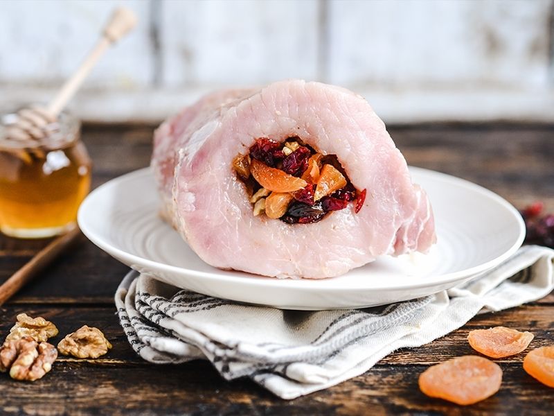 Do naczynia wsypujemy posiekane orzechy oraz bakalie. Dodajemy pozostałą marynatę i dokładnie mieszamy. Napełniamy mięso powstałym nadzieniem i odstawiamy na kilka godzin do lodówki (najlepiej na całą noc). Piekarnik nastawiamy na 180 C i pieczemy mięso ok. 60 min.