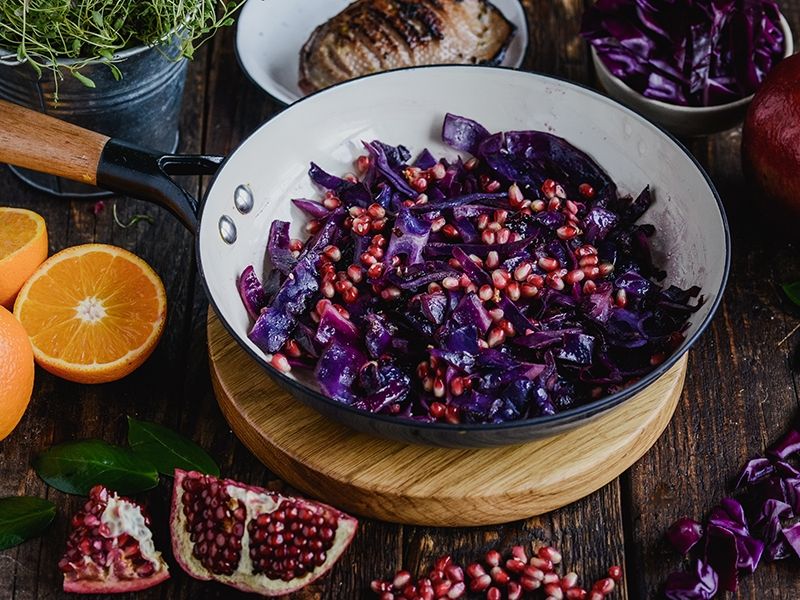 Kapustę drobno szatkujemy. Na dobrze rozgrzanej patelni z olejem podsmażamy posiekaną cebulę. Dokładamy kapustę i dusimy na średnim ogniu ok. 10 min, a następnie doprawiamy solą, pieprzem i wlewamy ok 200 ml wody. Dusimy na małym ogniu jeszcze ok. 30 min. Gdy kapusta zmięknie, doprawiamy ją octem balsamicznym, cukrem oraz sokiem z pomarańczy. Danie posypujemy pestkami granatu.