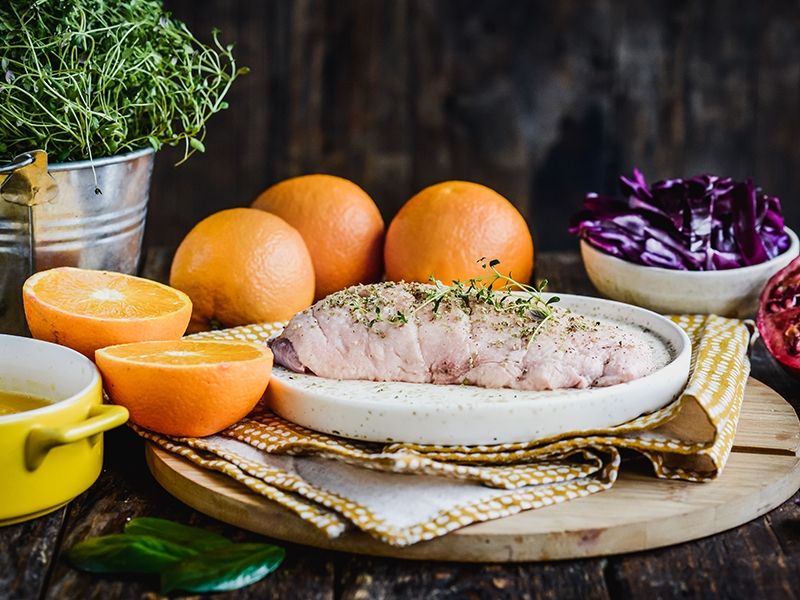 Jedną pomarańczę obieramy i filetujemy, natomiast z drugiej wyciskamy sok. Mięso umieszczamy w marynacie z soku i odstawiamy do lodówki na 1 h. Po wyjęciu z lodówki smażymy na rozgrzanej patelni, skórką do dołu, aż część tłuszczu się wytopi, po czym przekładamy mięso do naczynia żaroodpornego i pieczemy ok. 1 h w temperaturze 180 C. W międzyczasie polewamy gęś marynatą z pomarańczy, aby nie wyschła.