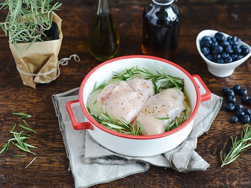 Piekarnik nagrzewamy do 180 C. Piersi z kurczaka dokładnie myjemy, oczyszczamy i osuszamy ręcznikiem papierowym. Obtaczamy w oliwie. Doprawiamy solą oraz pieprzem. Cebulę kroimy w krążki. Układamy ją na dnie naczynia żaroodpornego, po czym skrapiamy oliwą. Na cebuli układamy piersi z kurczaka i posypujemy świeżymi gałązkami rozmarynu. Wkładamy do piekarnika na 30 min.