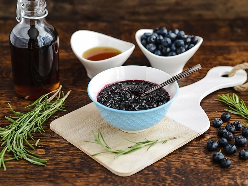 W rondelku podgrzewamy borówki. Dodajemy ocet balsamiczny, syrop klonowy oraz musztardę i doprowadzamy do wrzenia. Możemy doprawić solą i pieprzem. Gdy sos się zredukuje, odstawiamy go na bok. Pod koniec pieczenia polewamy sosem piersi z kurczaka. Zapiekamy jeszcze 10 min. i podajemy mięso wraz z powstałym sosem.