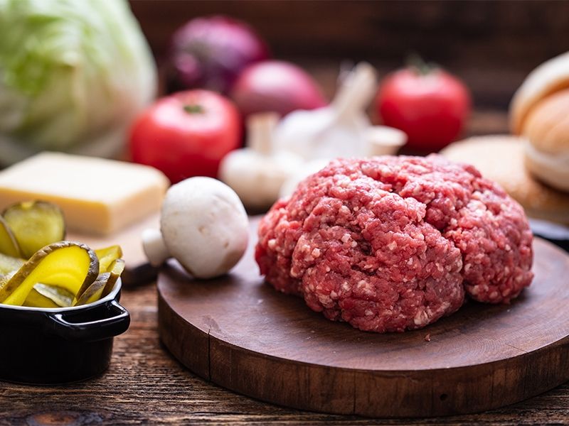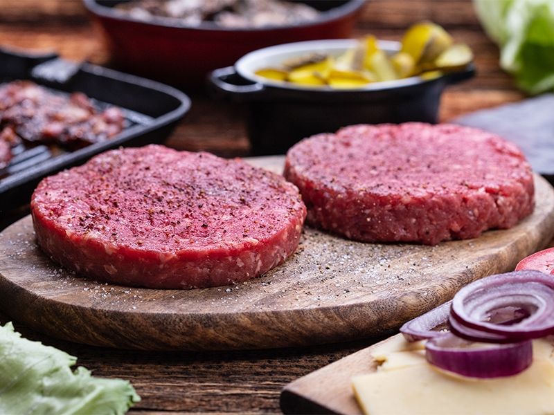 Z mięsa formujemy burgery nieco większe od średnicy bułki (grubość ok. 2cm). W środku burgera robimy lekkie wgniecenie. Smarujemy z obu stron oliwą, posypujemy solą i pieprzem.