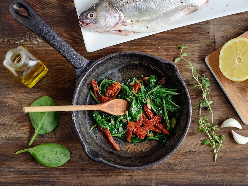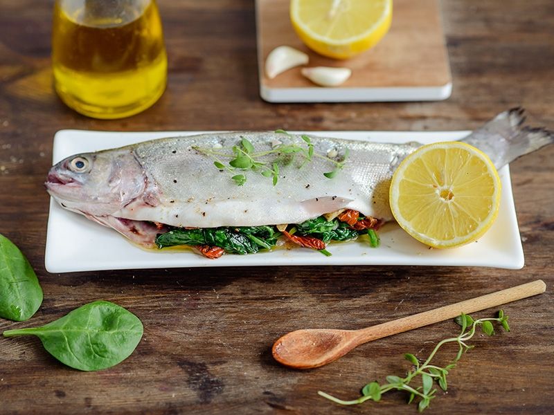 Pstrąga myjemy, osuszamy ręcznikiem papierowym, posypujemy pieprzem, solą i odstawiamy na 30 minut do lodówki. W międzyczasie na patelni rozgrzewamy łyżkę masła, dodajemy posiekany czosnek, a po chwili umyty szpinak. Całość dusimy pod przykryciem. Następnie dodajemy pokrojone suszone pomidory i mieszamy. Powstałym nadzieniem faszerujemy pstrąga.