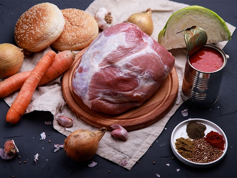Jabłko kroimy w talarki. Cebulę kroimy w ćwiartki i wraz z jabłkiem układamy w naczyniu żaroodpornym. Dodajemy 6 ząbków czosnku. Na górę kładziemy łopatkę wieprzową, przykrywamy pokrywą lub folią aluminiową i wstawiamy do piekarnika nagrzanego do 140oC na 6 godzin. W połowie czasu pieczenia możemy podlać mięso wodą lub sokami spod mięsa. Po upływie 6 godzin zdejmujemy pokrywkę, podkręcamy temperaturę do 200oC i pieczemy jeszcze przez 30 minut.