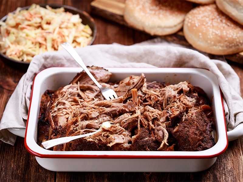 Mięso wyciągamy na deskę i dwoma widelcami rozszarpujemy na cienkie włókna.