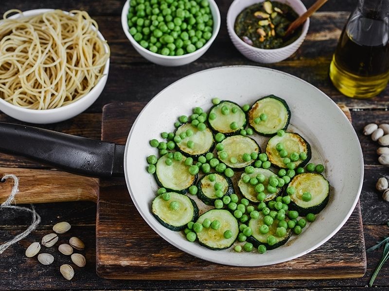 Na patelni rozgrzewamy łyżkę oliwy. Dodajemy pokrojoną w plasterki cukinię i podsmażamy 2-3 min. do zarumienienia. W osobnym rondelku gotujemy wodę i umieszczamy w nim groszek. Gotujemy 2-3 min, aż będzie miękki, następnie odcedzamy.