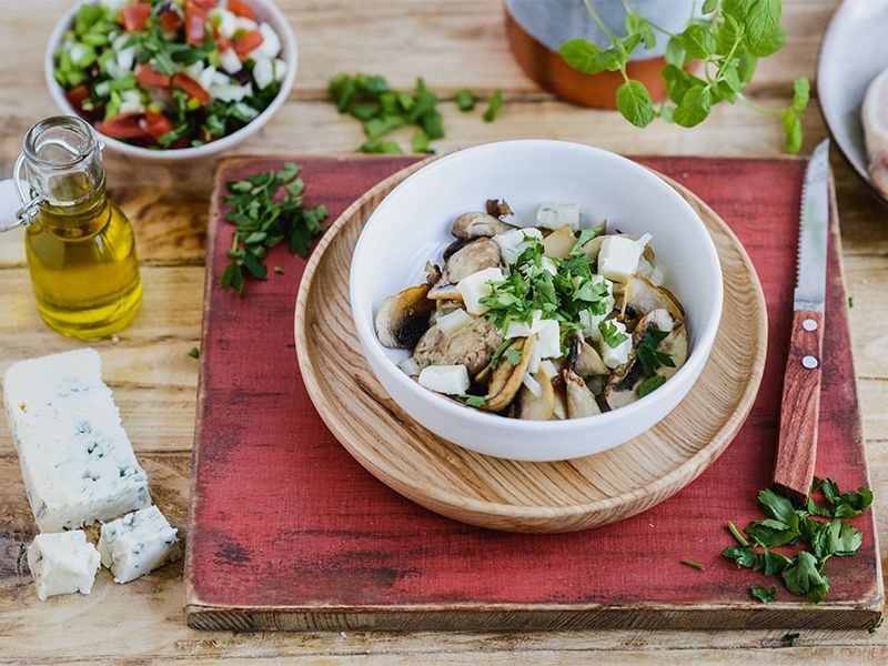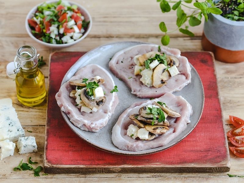 Piekarnik nagrzewamy do 180 C. Gorgonzole kroimy w kosteczkę. Dodajemy posiekana natkę pietruszki oraz pieczarki. Doprawiamy sola oraz pieprzem. Dokładnie mieszamy. Na każdy kotlet nakładamy po łyżce farszu i zawijamy w rulonik lub kopertę. Spinamy wykałaczką, aby farsz nie wypłynął. Kotleciki obsmażamy na łyżce oliwy do zarumienienia następnie wkładamy do naczynia żaroodpornego i pieczemy w piekarniku ok. 25 min.