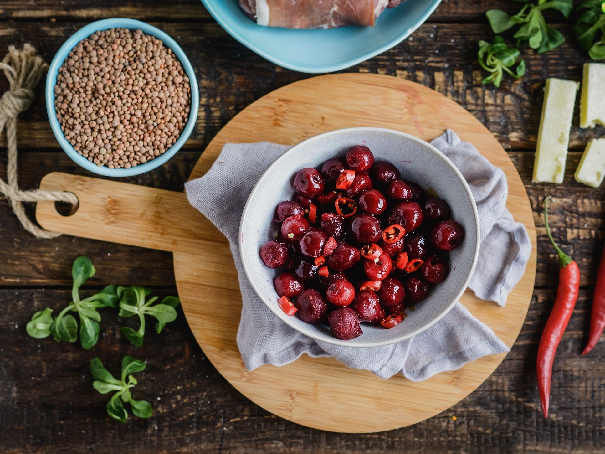 Soczewicę gotujemy w lekko osolonej wodzie przez 15 min. Wiśnie rozmrażamy w miseczce. Dodajemy posiekane chili, ocet balsamiczny oraz mąkę ziemniaczaną. Dokładnie mieszamy.