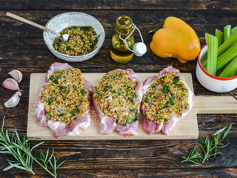 W miseczce mieszamy musztardę z natką pietruszki, łyżką oliwy, startym czosnkiem, papryką oraz tymiankiem. Tak powstałą marynatą smarujemy mięso i odstawiamy na noc do lodówki.