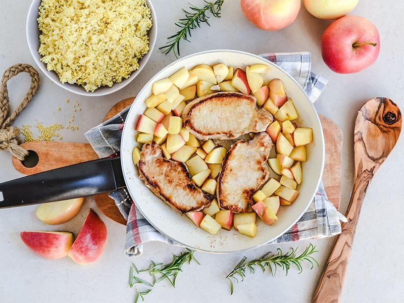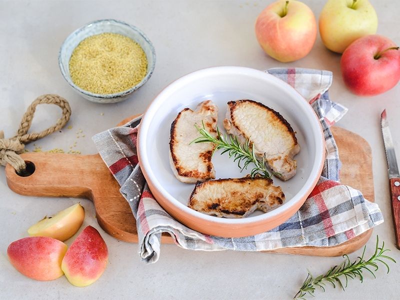 W międzyczasie kaszę jaglaną gotujemy w 300 ml lekko posolonej wody przez 10-15 min., aż wchłonie cały płyn. Na talerz kładziemy porcję kaszy. Następnie plaster schabu, a na górę karmelizowane jabłka. Całość dekorujemy świeżym rozmarynem.