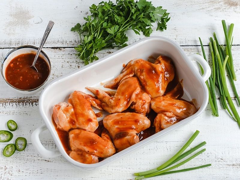 Skrzydełka myjemy, przekładamy do miski, zalewamy sosem i odstawiamy na godzinę do lodówki. Piekarnik nagrzewamy do 200 C. Skrzydełka układamy w naczyniu żaroodpornym i pieczemy ok. 20 min. do zarumienienia (możemy również upiec je na grillu). Podajemy z sałatką i np. kolbą kukurydzy.