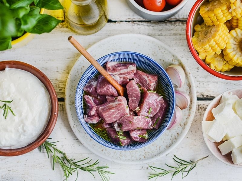 Oliwę mieszamy z przeciśniętym przez praskę czosnkiem, posiekanym rozmarynem. Doprawiamy solą oraz pieprzem. W powstałej marynacie obtaczamy pokrojone w grubą kostkę mięso. Odkładamy na całą noc do lodówki.