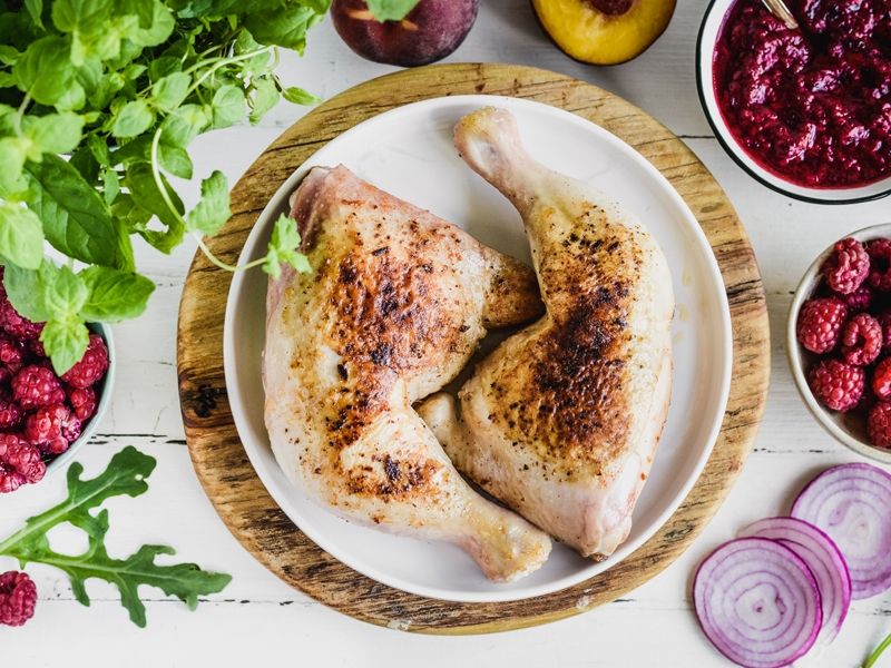 Ćwiartki z kurczaka myjemy i osuszamy ręcznikiem papierowym. Oprószamy solą oraz pieprzem, słodką papryka oraz nacieramy oliwą. Odstawiamy na 30 min do lodówki. Na rozgrzanej patelni smażymy kurczaka na średnim ogniu często go obracając. Po 30 min możemy dodać 4-5 łyżek sosu malinowego i smażymy na niewielkim ogniu kolejne 40 min.
