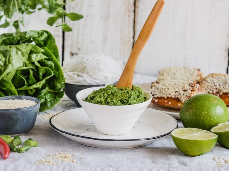 Do malaksera wrzucamy imbir, ząbki czosnku, papryczkę chili, cebule dymkę, kolendrę. Całość zalewamy olejem i blendujemy na gładka pastę. Doprawiamy do smaku solą.