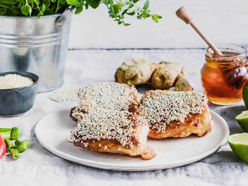 Na patelni rozgrzewamy łyżkę oliwy. Udka z kurczaka myjemy i nacieramy solą. Smażymy na rozgrzanej patelni skórką do dołu do zarumienienia ok 10 min. Następnie przekładamy na druga stronę. Zlewamy wytopiony tłuszcz i dodajemy miód. Smażymy dalej udka na małym ogniu. Na osobnej patelni podprażamy sezam. Posypujemy nim udka ( dzięki marynacie z miodu, ziarna sezamu dobrze przylegają do mięsa). Odstawiamy je na bok.