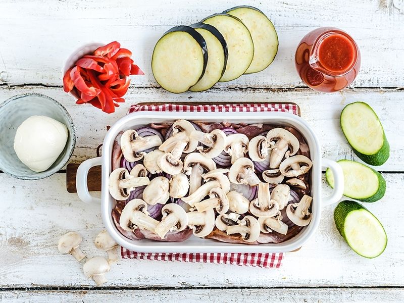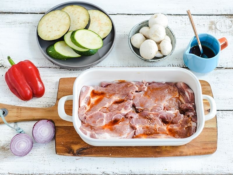 Piekarnik nagrzewamy do 180 C. W międzyczasie olej mieszamy z solą, pieprzem, papryką ostrą, słodką oraz startym czosnkiem. Tak powstałą marynatą nacieramy mięso. Układamy je na dnie naczynia żaroodpornego. Następnie układamy warstwami plastry cebuli, pieczarki pokrojone w plastry, paprykę, plastry cukinii, bakłażana.