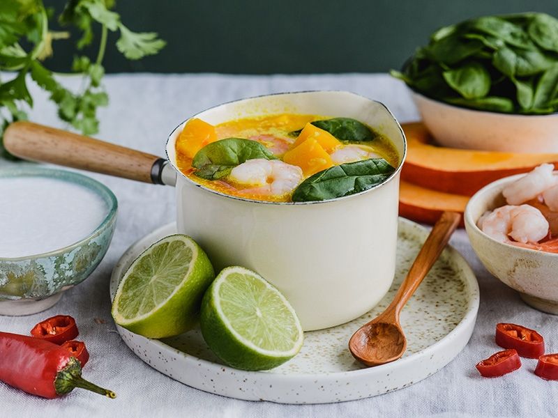 Wlewamy bulion oraz mleczko kokosowe i doprowadzamy zupę do wrzenia, następnie gotujemy przez ok. 6-7 min, dodając na koniec krewetki oraz umyty szpinak. Gotujemy jeszcze 3 min. Przed podaniem danie skrapiamy sokiem z limonki oraz posypujemy kolendrą.