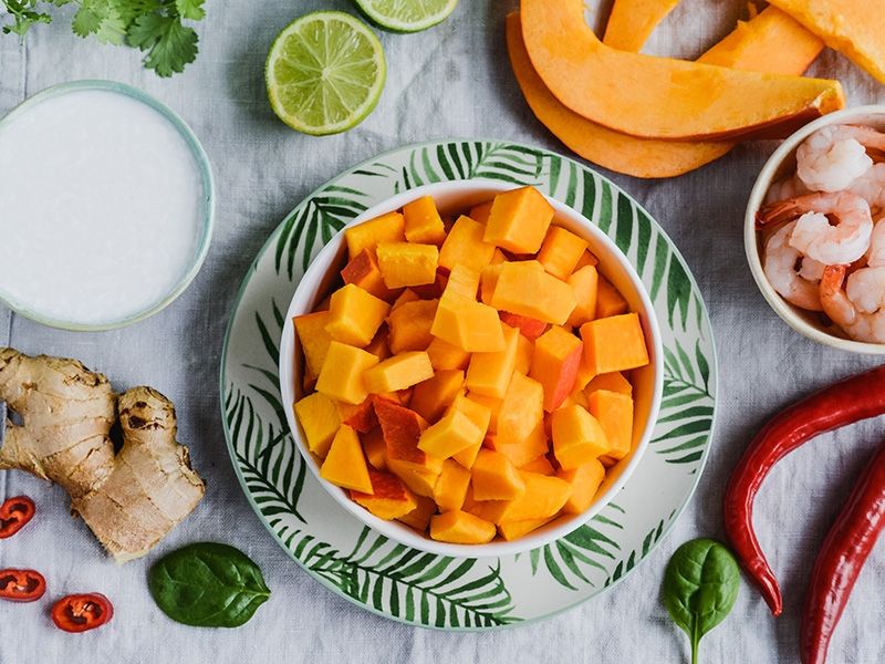 W rondelku rozpuszczamy olej kokosowy. Dodajemy starty na tarce imbir, czosnek oraz drobno pokrojone chili. Podsmażamy przez 2-3 min cały czas mieszając, następnie dodajemy pokrojoną w kostkę dynię i smażymy wszystko 3-4 min, aż nieco zmięknie.