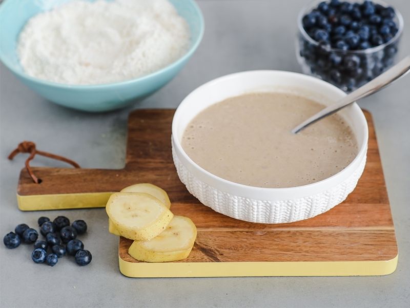 Do miski wrzucamy pokrojone banany, olej oraz jajko. Całość miksujemy na gładki krem. Do drugiego naczynia przesiewamy mąkę, dodajemy proszek do pieczenia oraz cukier. Następnie delikatnie mieszamy mokre składniki wraz z suchymi. Dodajemy borówki amerykańskie.