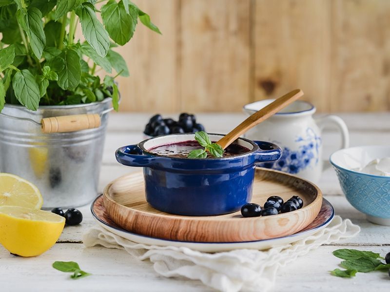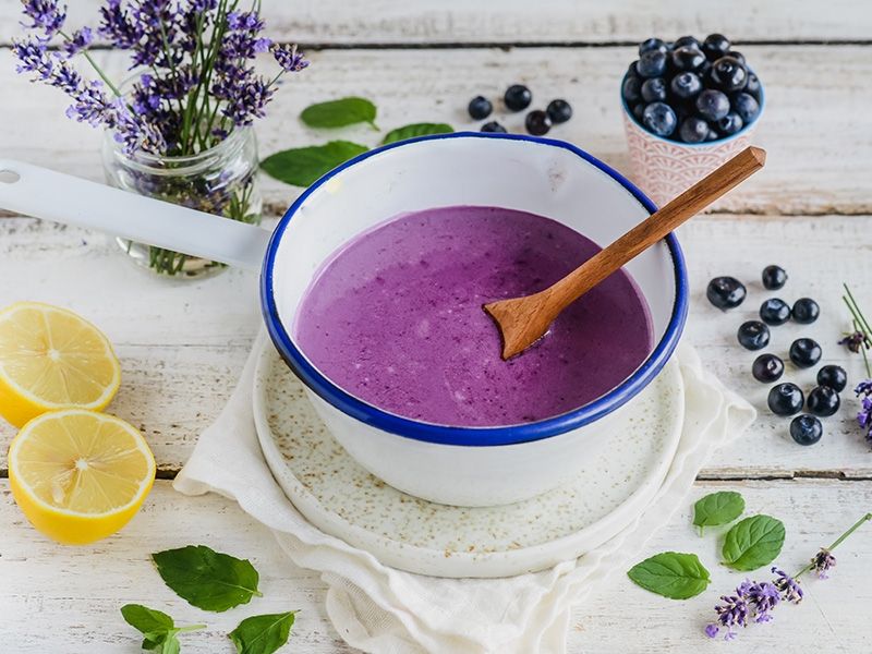 W rondelku podgrzewamy borówki amerykańskie z sokiem z cytryny oraz cukrem. Gdy składniki się zagotują, a owoce rozpadną, blendujemy je na gładki mus. Możemy przetrzeć go dodatkowo przez sito, aby pozbyć się skórek, ale nie jest to konieczne.