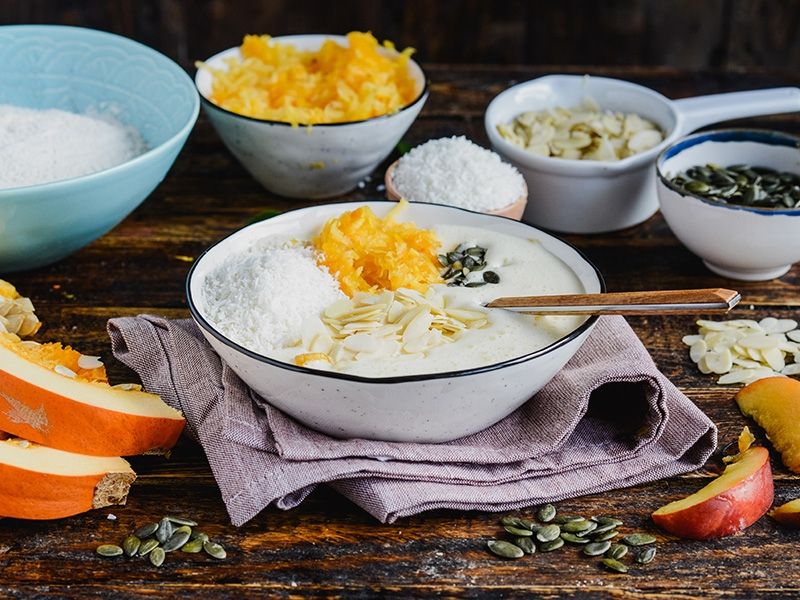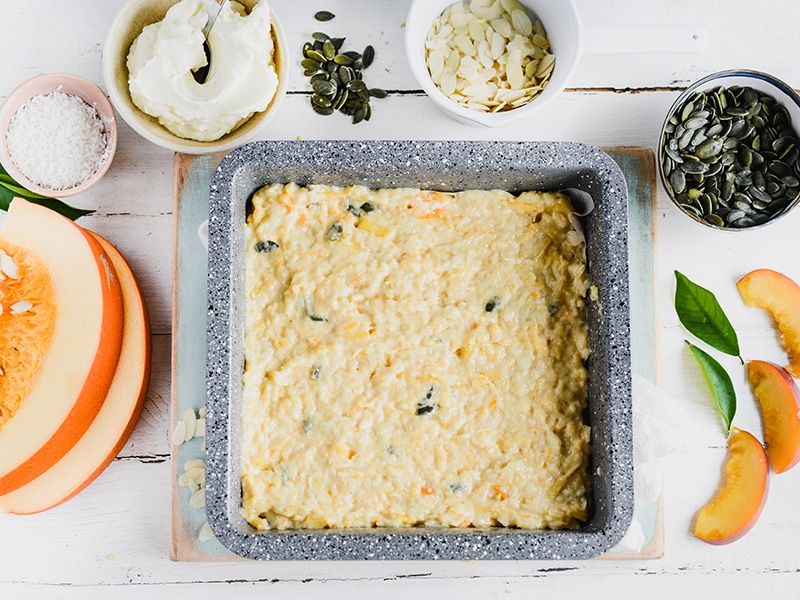 Mąkę przesiewamy do miski, dodajemy sodę, proszek do pieczenia oraz sól. Do miksera wbijamy jajka i ubijamy na gładką masę. Następnie dodajemy cukier i ubijamy dalej. Pod koniec wlewamy olej i dalej miksujemy. Do powstałej kremowej masy dodajemy startą na grubych oczkach surową dynię, pestki dyni, wiórki kokosa oraz lekko rozgniecione płatki migdałowe ( lub, jeśli wolisz, inne orzechy – np. włoskie czy laskowe). Dodajemy drobno posiekaną lub zblendowaną brzoskwinię. Całość mieszamy, przekładamy do miski z mąką i ponownie delikatnie mieszamy.