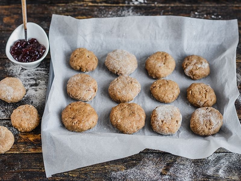 Piekarnik nastawiamy na 160 C. Ciasto przekładamy na stolnicę. Dzielimy na mniejsze kawałki i formujemy z nich kulki. W środka każdej kuleczki dodajemy ulubiony dżem lub konfiturę, dokładnie sklejamy i umieszczamy na blaszce wyłożonej papierem do pieczenia. Paczki pieczemy ok 25 min. Wyciągamy i studzimy.