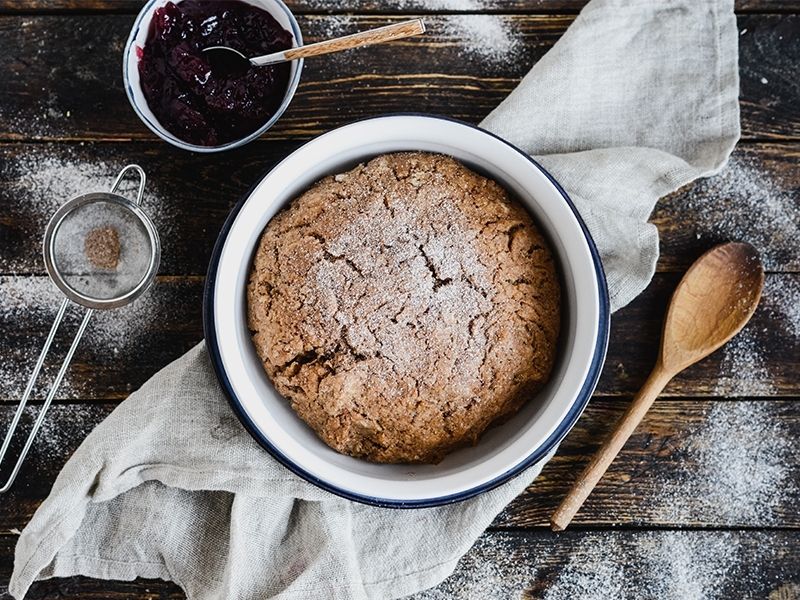 Mąkę przesypujemy do miski. Dodajemy ksylitol, cynamon, sól, oraz zaczyn. Całość delikatnie mieszamy, następnie dokładamy jajka oraz roztopione masło. Wyrabiamy, aż ciasto będzie gładkie i elastyczne. Odstawiamy na godzinę pod przykryciem do wyrośnięcia.